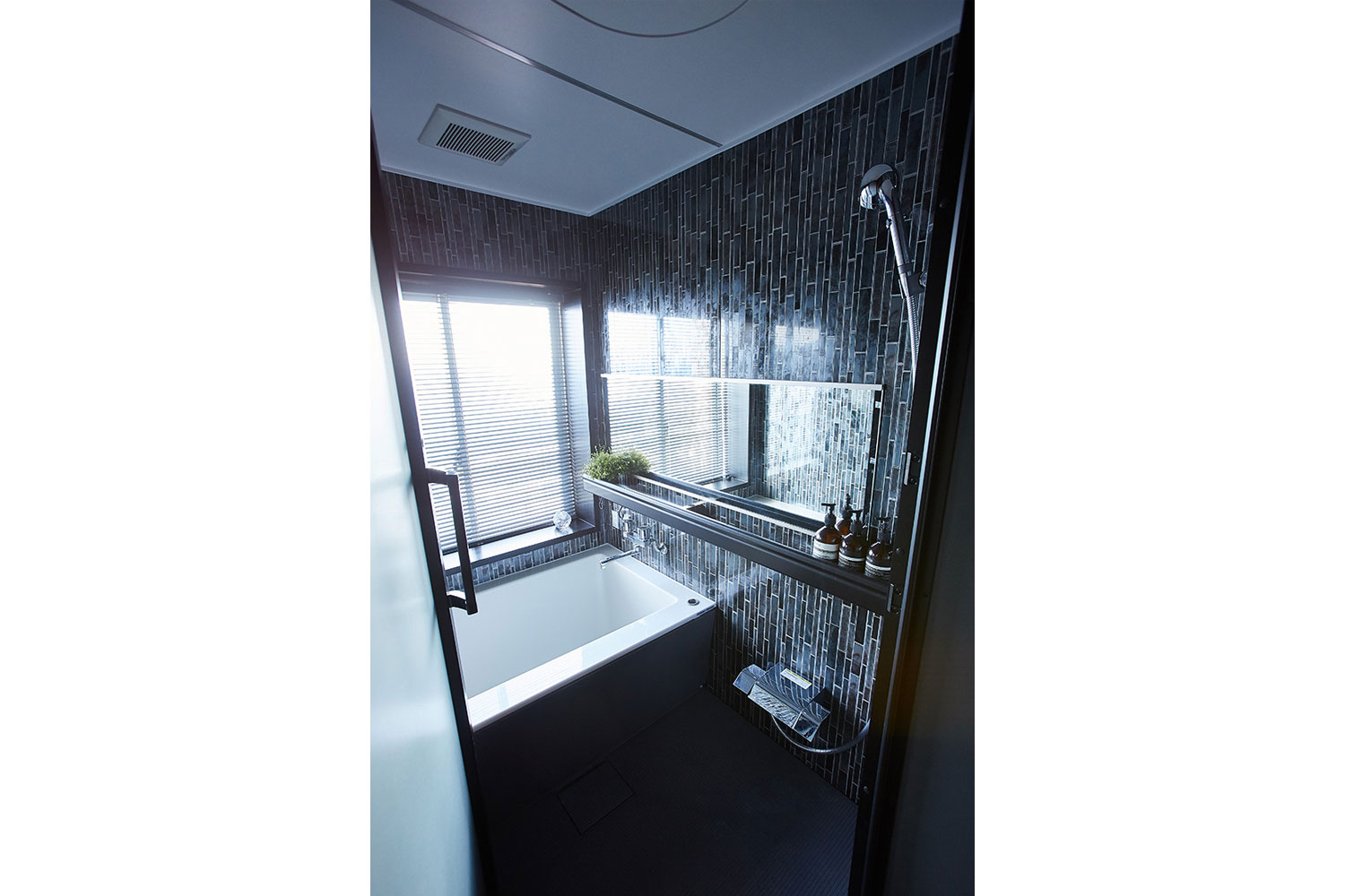 リビングと寝室をゆるやかに一体化し、段差でゾーニングすることで、空間の広がりと開放感を確保。濃淡のグレーとロースタイルの家具が、洗練されたホテルライクな空間を演出します。