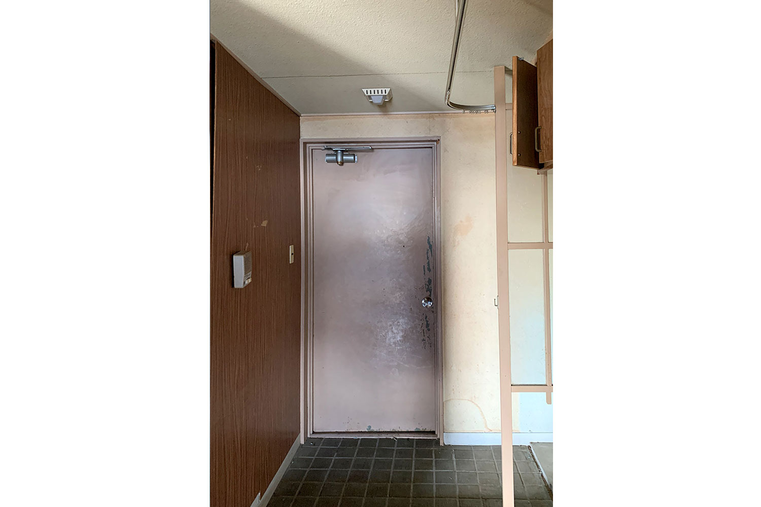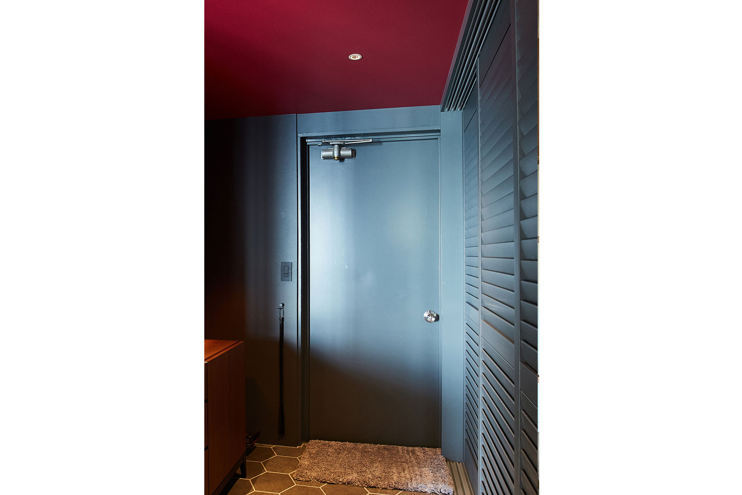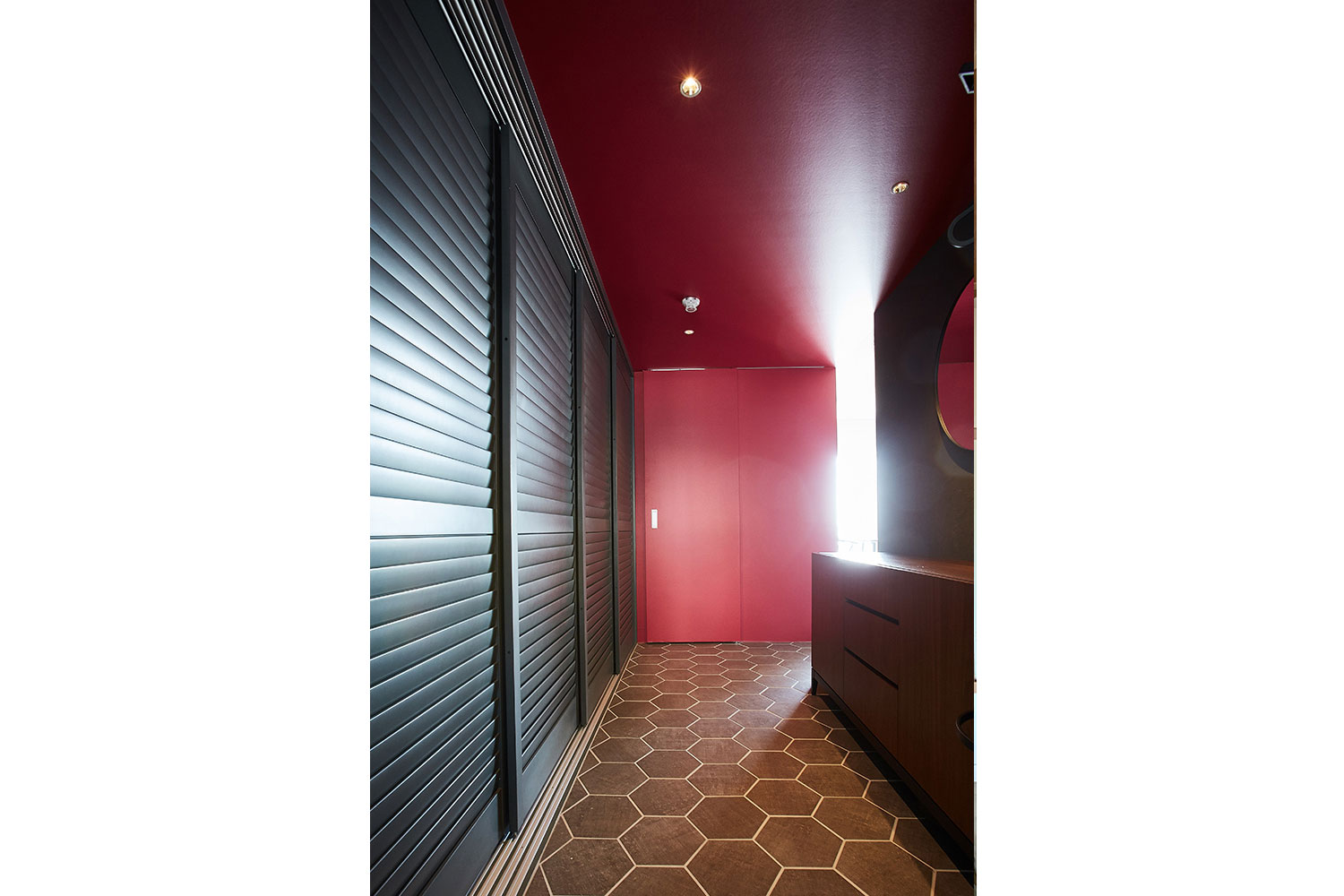 メイン空間のニュートラルなトーンから、エントランスや通路へと続くこのエリアは、コントラストの効いた色彩で空間を引き締めています。