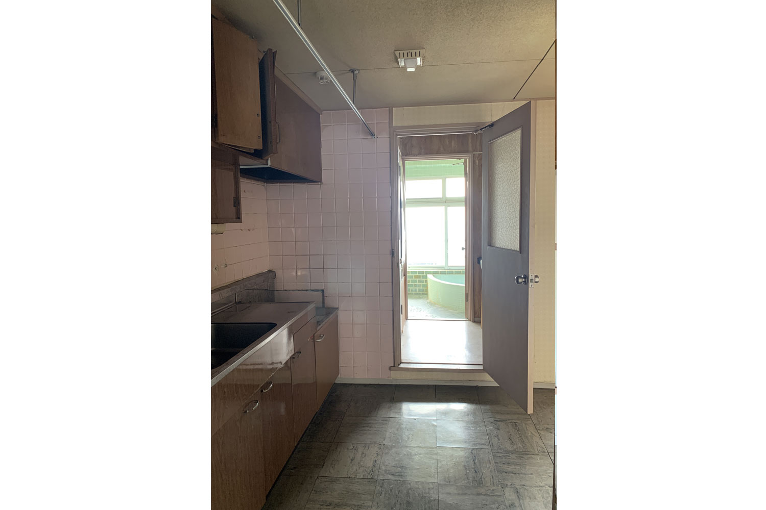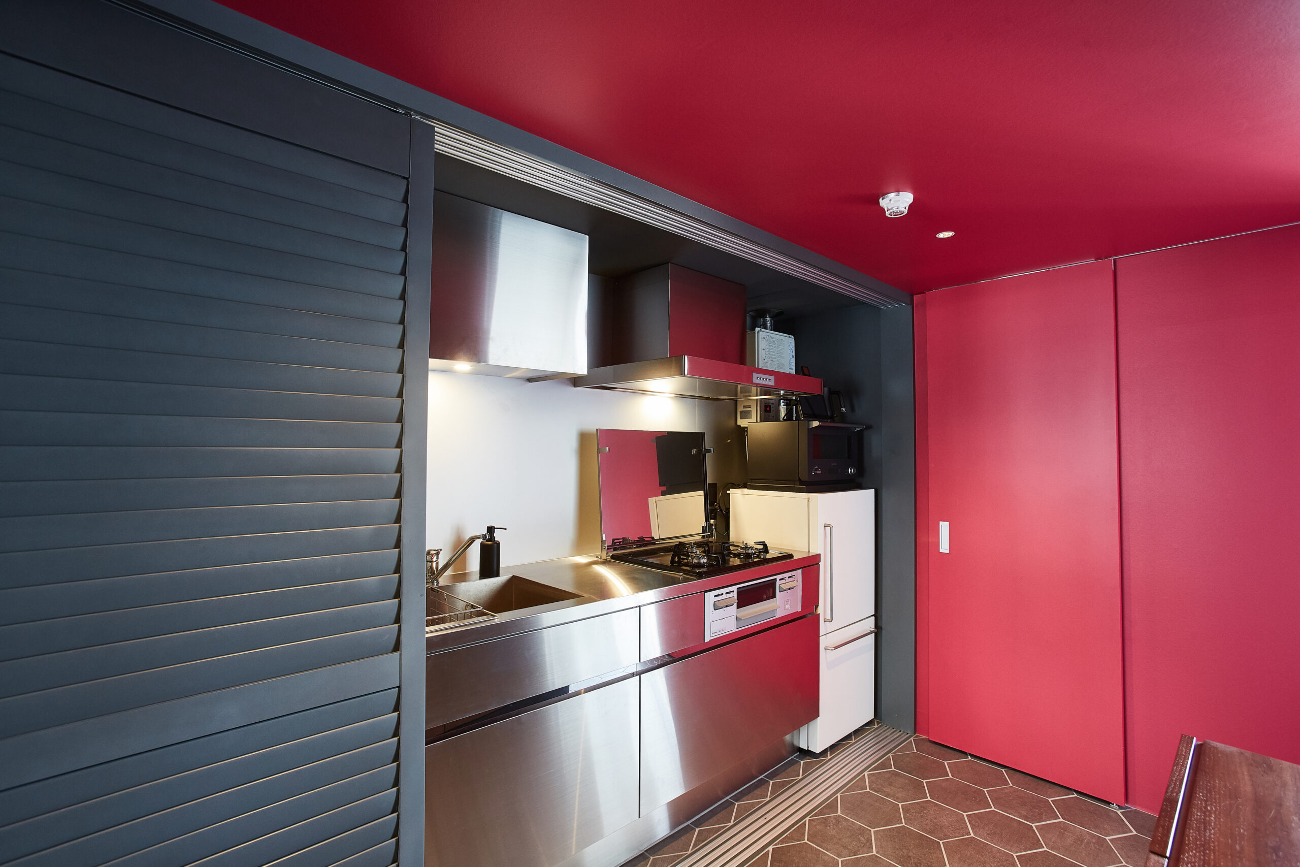 生活感を排し、空間の美しさを追求した別荘マンションならではのキッチン。 キッチン全体を、ルーバー調のダークな引き戸の裏に完全に隠せる設計としました。 これにより、「いつも使わないから、使う時だけ出す」というコンセプトを実現し、使用しないときは生活感を完全にシャットアウト。リビング空間の洗練された雰囲気を保ちます。
